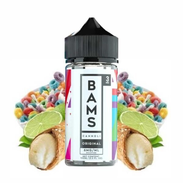 Bam’s Cannoli Original Cannoli, una mezcla exquisita diseñada para deleitar a los entusiastas del vapeo de postres. Este líquido de primera calidad presenta una exclusiva cáscara de cannoli de cereales afrutados rellena con un sabroso relleno de lima, coronada con un remolino de crema batida y una pizca adicional de cereales afrutados.