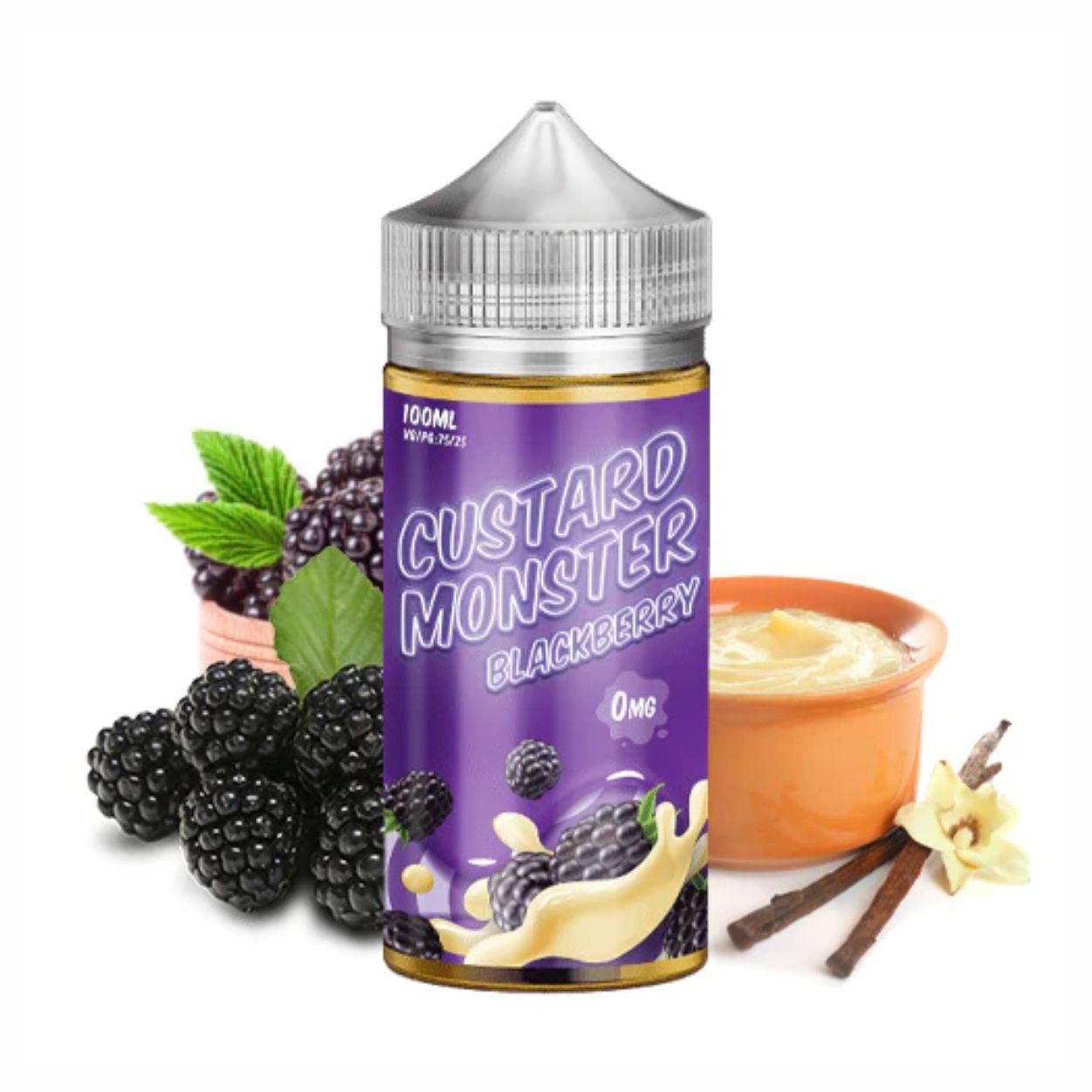 Custard Monster Blackberry Custard es una base espesa y cremosa de natilla cubierta con moras ácidas y deliciosamente oscuras con un toque de dulzura.
