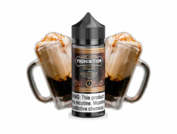 Viajeros cansados ​​de todas partes vienen al bar clandestino Prohibition Juice Co. para disfrutar de una exclusiva cerveza de raíz. Este galardonado e-juice personifica una cerveza de raíz dulce en una taza de vidrio esmerilado con una bola gigante de helado de vainilla.